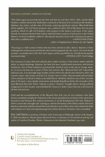 Our memory of Sixties New Left radicals often evokes marches in the streets, battles with the police, or urban bombings. However, the New Left was a multi-faceted movement, with diverse tendencies. One of these tendencies promoted electoral as the way to change America. In every city that was a center of New Left activism, this "Electoral New Left" entered the political arena. A surprisingly large number of these New Left radicals were elected to office: City Council, Mayor, State Senate, even the U.S. Senate. Once in office, they persisted and prevailed. Cities and places we think of today as eternally liberal-Berkeley, Madison, Ann Arbor, even the state of Vermont-were, deeply conservative and deeply Republican before the triumphs of the local Electoral New Left. These "Radicals in Power," however, brought about a lasting political realignment in their locales, and embodied the vision of a better future that was at the heart of all New Left activism. However, the accomplishments of the Electoral New Left, even its very existence, are almost completely unexplored. Historians of the social and political movements of the Sixties have focused on anti-Vietnam War protest movements, or on the Revolutionary New Left. Radicals in Power corrects that oversight and, in doing so, rewrites the history of the Sixties and the New Left. Based on interviews with the elected New Left radicals in each of their cities, Davin details the birth and evolution of a local and regional progressive politics that has, heretofore, been overlooked.