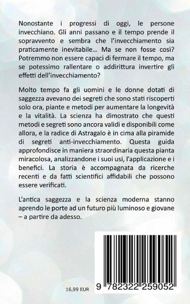 Nonostante i progressi di oggi, le persone invecchiano. Gli anni passano e il tempo prende il sopravvento e sembra che l'invecchiamento sia praticamente inevitabile... Ma se non fosse così? Potremmo non essere capaci di fermare il tempo, ma se potessimo rallentare o addirittura invertire gli effetti dell'invecchiamento? Molto tempo fa gli uomini e le donne dotati di saggezza avevano dei segreti che sono stati riscoperti solo ora, piante e metodi per aumentare la longevità e la vitalità. La scienza ha dimostrato che questi metodi e segreti sono ancora validi e disponibili come allora, e la radice di Astragalo è in cima alla piramide di segreti anti-invecchiamento. Questa guida approfondisce in maniera straordinaria questa pianta miracolosa, analizzandone i suoi usi, l'applicazione e i benefici. La storia è accompagnata da ricerche recenti e da fatti scientifici affidabili che possono essere verificati. L'antica saggezza e la scienza moderna stanno aprendo le porte ad un futuro più luminoso e giovane - a partire da adesso.