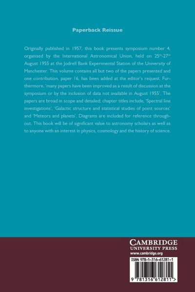 Originally published in 1957, this book presents symposium number 4, organised by the International Astronomical Union, held on 25th-27th August 1955 at the Jodrell Bank Experimental Station of the University of Manchester. This volume contains all but two of the papers presented and one contribution, paper 16, has been added at the editor's request. Furthermore, 'many papers have been improved as a result of discussion at the symposium or by the inclusion of data not available in August 1955'. The papers are broad in scope and detailed; chapter titles include, 'Spectral line investigations', 'Galactic structure and statistical studies of point sources' and 'Meteors and planets'. Diagrams are included for reference throughout. This book will be of significant value to astronomy scholars as well as to anyone with an interest in physics, cosmology and the history of science.