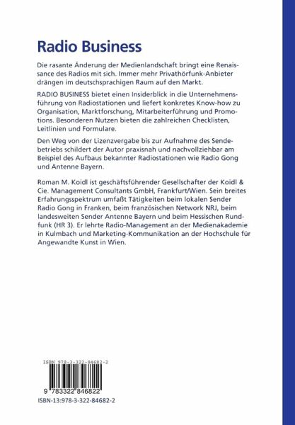 "Radio Business" bietet einen Insiderblick in die Unternehmensführung von Radiostationen und liefert konkretes Know-how zu Organisation, Marktforschung, Mitarbeiterführung und Promotions. Besonderen Nutzen bieten die zahlreichen Checklisten, Leitlinien und Formulare.