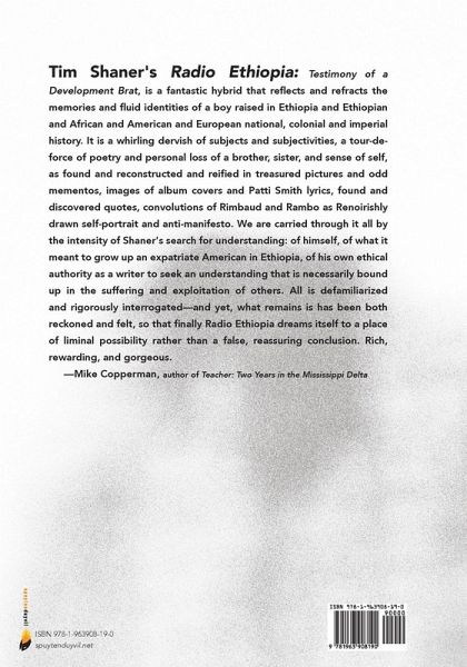 Tim Shaner's Radio Ethiopia: Testimony of a Development Brat, is a fantastic hybrid that reflects and refracts the memories and fluid identities of a boy raised in Ethiopia and Ethiopian and African and American and European national, colonial and imperial history. It is a whirling dervish of subjects and subjectivities, a tour-de-force of poetry and personal loss of a brother, sister, and sense of self, as found and reconstructed and reified in treasured pictures and odd mementos, images of album covers and Patti Smith lyrics, found and discovered quotes, convolutions of Rimbaud and Rambo as Renoirishly drawn self-portrait and anti-manifesto.
