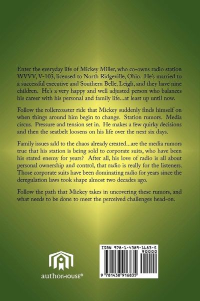 Enter the everyday life of Mickey Miller, who co-owns radio station WVVV, V-103, licensed to North Ridgeville, Ohio. He's married to a successful executive and Southern Belle, Leigh, and they have nine children. He's a very happy and well adjusted person who balances his career with his personal and family life...at least up until now. Follow the rollercoaster ride that Mickey suddenly finds himself on when things around him begin to change. Station rumors. Media circus. Pressure and tension set in. He makes a few quirky decisions and then the seatbelt loosens on his life over the next six days. Family issues add to the chaos already created...are the media rumors true that his station is being sold to corporate suits, who have been his stated enemy for years? After all, his love of radio is all about personal ownership and control, that radio is really for the listeners. Those corporate suits have been dominating radio for years since the deregulation laws took shape almost two decades ago. Follow the path that Mickey takes in uncovering these rumors, and what needs to be done to meet the perceived challenges head-on.