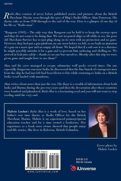 Radio Man consists of never before published stories and pictures about the British Merchant Marine seen through the eyes of Ship's Radio Officer Alan Patterson. His diaries take us from 1938 through to the end of the war. Here is a glimpse of one day of his life as "Radio man". "Rangoon (1942)- The only way that Rangoon can be held is to keep the seaway open and they do not seem to be doing that. We saw no patrol ships at all while at sea, the poor old Merchant Service has to just plug along on its own with no protection and no guns. However, they had put a gun platform on our stern before we left, so we built an imitation of a gun on a mast spar and an empty oil drum. We hoped that if a sub saw it at a distance he might possibly mistake it for a gun and so prevent him surfacing and shelling us. We arrived in Calcutta safely-thanks to no one but ourselves. Shortly after this trip we were given guns and taught how to use them!" Alan and his crew managed to escape submarine wolf packs several times. On one especially dangerous run near India, he discovered that the fine bunch of courageous men from the ship he had just left had been blown to bits while returning to India on a British India vessel loaded with munitions. Alan writes about more than just the war. His diary is a wealth of information about both India and Burma during the pre-war years and then the devastation after those countries were bombed and plundered. Radio Man is a fascinating read and you will not want to stop reading until the very end.