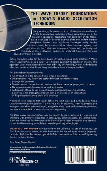 Setting the cutting edge for the field, Radio Occultations Using Earth Satellites: A Wave Theory Treatment develops a purely wave-theoretic approach to occultation analysis. This approach yields more nuanced results than either ray or hybrid (ray/wave) methodologies offer, and proves suitable for the many variables at work in today's problems.