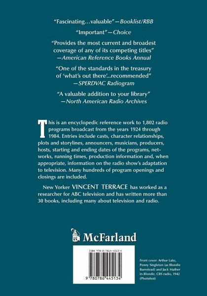 This is an encyclopedic reference work to 1,802 radio programs broadcast from the years 1924 through 1984. Entries include casts, character relationships, plots and storylines, announcers, musicians, producers, hosts, starting and ending dates of the programs, networks, running times, production information and, when appropriate, information on the radio show's adaptation to television. Many hundreds of program openings and closings are included.