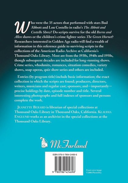 Who were the 35 actors that performed with stars Bud Abbott and Lou Costello in radio's The Abbott and Costello Show? Do scripts survive for the old Burns and Allen shows or the children's crime fighter series The Green Hornet? Serious researchers and curious browsers interested in Golden Age radio will find a wealth of information in this reference collection. Most are from the 1930s, 1940s and 1950s, though subsequent decades are included for long-running shows. Crime series, whodunits, romances, situation comedies, variety shows, soap operas, quiz show series and others are included. Casual browsers will find tidbits on the radio careers of notables from other media (Humphrey Bogart, Ginger Rogers), mention of adaptations by famous authors (Jack London, Ray Bradbury), curious episode titles (""The Gorilla That Always Said Yeh-ah"") and series titles (Whispering Streets), and interesting sponsors (Insect-O-Blitz). The first section is an alphabetical list of T.O. Library's significant radio script collections, with notes on their content and format. The second section is the guide to series scripts by program title. Entries include title and basic information, including collection(s) in which they are found; producers, directors, writers, musicians and regular cast; sponsors; and holdings by date, episode number and title. Increasing the book's usefulness for researchers are indexes by name, program and sponsor.