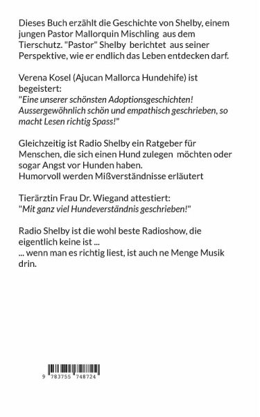 Radio-Shelby beschreibt wie ein Hund aus dem Tierschutz seine ersten Schritte in die Welt macht. Das Buch ist aus der Perspektive von "Shelby" geschrieben. Er hat eine eigene Radioshow und erzählt zwischen den Songs auf humorvolle was er erlebt.Gleichzeitig ist es ein humorvoller Ratgeber, der viel wissenswertes über Hunde vermittelt.