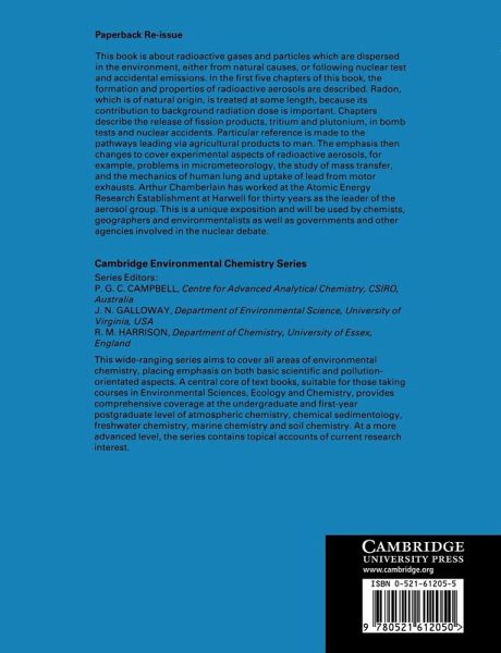 This book is about radioactive gases and particles which are dispersed in the environment, either from natural causes, or following nuclear test and accidental emissions. In the first five chapters of this book, the formation and properties of radioactive aerosols are described. Radon, which is of natural origin, is treated at some length, because its contribution to background radiation dose is important. Chapters describe the release of fission products, tritium and plutonium, in bomb tests and nuclear accidents. Particular reference is made to the pathways leading via agricultural products to man. The emphasis then changes to cover experimental aspects of radioactive aerosols. For example, problems in micrometeorology, the study of mass transfer, the mechanics of the human lung and uptake of lead from motor exhausts. Arthur Chamberlain has worked at the Atomic Energy Research Establishment at Harwell for thirty years as the leader of the Aerosol Group. It is a unique exposition and will be used by chemists, geographers, environmentalists as well as governments and other agencies involved in the nuclear debate.