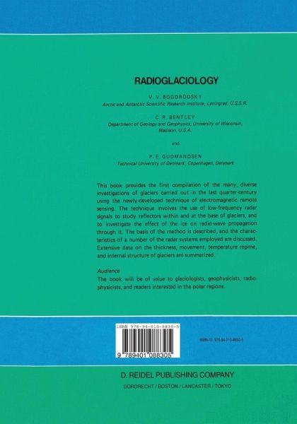 1: A Brief Survey of the Earth's Ice Cover and Methods for its Investigation.- 1.1. The Geographical Distribution of Glaciers.- 1.2. Impact of Ice on Geophysical Processes.- 1.3. The Seismic Method.- 1.4. Gravitational and Magnetic Methods.- 1.5. Radar Sounding.- References: Chapter 1.- 2: Structure and Physical State of Glaciers.- 2.1. Internal Structure of Glaciers.- 2.2. Stratification and Temperature Regime of Glaciers.- 2.3. Glacier Regimen.- References: Chapter 2.- 3: Electromagnetic Wave Propagation in Ice.- 3.1. Crystalline Structure of Ice.- 3.2. The Electrical Properties of Monocrystalline Ice.- 3.3. Values of the Electrical Parameters.- 3.4. Pure Polycrystalline Ice.- 3.5. Impure Polycrystalline Ice.- 3.6. Snow.- 3.7. Propagation of Electromagnetic Waves in Glaciers.- References: Chapter 3.- 4: Equipment for Radar Sounding of Glaciers.- 4.1. Analysis.- 4.2. Estimation of Sounding Accuracy.- 4.3. Equipment to Measure the Thickness of Cold Glaciers.- 4.4. Equipment to Measure the Thickness of Temperate Glaciers.- 4.5. Radars to Study Internal Structure and State.- 4.6. Radars for Ice Movement Measurements.- 4.7. Laser Technique.- 4.8. Equipment of U.S.A., Denmark, and Great Britain for Radar Sounding of Cold Glaciers.- 4.9. Equipment of U.S.A., Denmark, and Great Britain for Radar Sounding of Temperate Glaciers.- 4.10. Specialized Equipment.- References: Chapter 4.- 5: Methods of Acquisition and Processing of Data.- 5.1. Radioglaciological Data Recording.- 5.2. Digital and Photographic Recording of Radioglaciological Observations.- References: Chapter 5.- 6: Scientific Results in Radioglaciology.- 6.1. Direct Measurements of Permittivity and Conductivity.- 6.2. Electromagnetic Wave Speed and its Measurement.- 6.3. Lateral Waves.- 6.4. Absorption ofElectromagnetic Waves.- 6.5. Polarization Studies.- 6.6. Ice Thickness and Subglacial Topography.- 6.7. Subglacial Physiography and Geology.- 6.8. Radar Sounding of Internal Layering.- 6.9. Movement of Glaciers.- 6.10. Nature of the Basal Interface.- 6.11. Detection of Hidden Crevasses.- 6.12. Estimation of Glacial Water Content.- References: Chapter 6.- Conclusion.