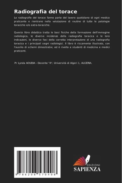 Le radiografie del torace fanno parte del lavoro quotidiano di ogni medico praticante e rientrano nella valutazione di routine di tutte le patologie toraciche e/o extra-toraciche.Questo libro didattico tratta le basi fisiche della formazione dell'immagine radiologica, le diverse incidenze della radiografia toracica e le loro indicazioni, le diverse fasi della corretta interpretazione di una radiografia toracica e i principali segni radiologici. Il libro è riccamente illustrato, con l'ausilio di schemi dimostrativi, ed è rivolto a studenti di medicina e medici praticanti.