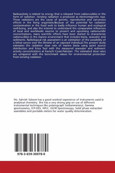 Radioactivity is related to energy that is released from radionuclides in the form of radiation. Ionizing radiation is produced as electromagnetic rays. These radiations are the cause of genetic, reproductive and cancerous effects in the living organisms.Because of the potential for radiation contamination in the food web to badly influence human and ecological well-being, and also the interest to understand the comparative influences of local and worldwide sources to present and upcoming radionuclide concentrations, many scientific efforts have been started to characterize radionuclides in the marine environment that includes biota, seawater and sediments. Radiological risk assessment is an estimation of the possibility of a lethal cancer over the lifetime of an exposed individual.The present study estimates the radiation dose rate of marine biota using point source distribution and Erica Tool with the measured seawater and sediment activity concentrations at Karachi Coast-Pakistan. The estimated dose rates are compared with the benchmark values for environmental protection from ionizing radiation.