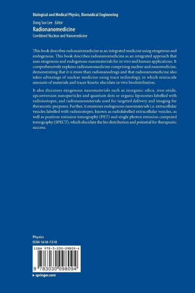 Introduction of Radionanomedicine.- Exogenous Radionanomedicine.- Endogenous Radionanomedicine.- Surface Modification and Radiolabeling.- Targeted Delivery with Click Chemistry.- In-vivo Biodistribution Using PET and SPECT.- Factors and Results Affecting Biodistribution.- Immune Responses to Nanomaterials.- Molecular Imaging.- Theranostic Utility.