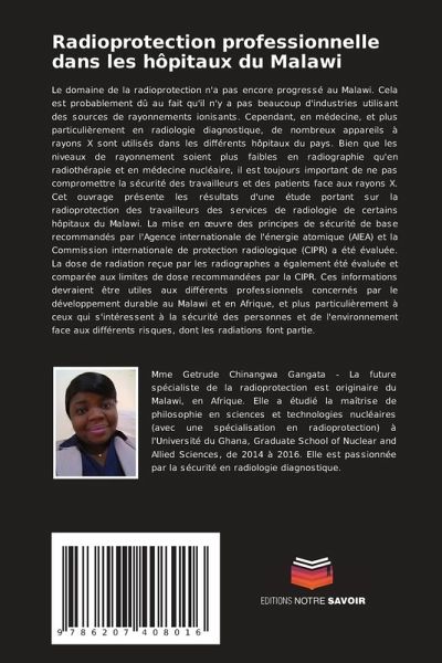 Le domaine de la radioprotection n'a pas encore progressé au Malawi. Cela est probablement dû au fait qu'il n'y a pas beaucoup d'industries utilisant des sources de rayonnements ionisants. Cependant, en médecine, et plus particulièrement en radiologie diagnostique, de nombreux appareils à rayons X sont utilisés dans les différents hôpitaux du pays. Bien que les niveaux de rayonnement soient plus faibles en radiographie qu'en radiothérapie et en médecine nucléaire, il est toujours important de ne pas compromettre la sécurité des travailleurs et des patients face aux rayons X. Cet ouvrage présente les résultats d'une étude portant sur la radioprotection des travailleurs des services de radiologie de certains hôpitaux du Malawi. La mise en oeuvre des principes de sécurité de base recommandés par l'Agence internationale de l'énergie atomique (AIEA) et la Commission internationale de protection radiologique (CIPR) a été évaluée. La dose de radiation reçue par les radiographes a également été évaluée et comparée aux limites de dose recommandées par la CIPR. Ces informations devraient être utiles aux différents professionnels concernés par le développement durable au Malawi et en Afrique, et plus particulièrement à ceux qui s'intéressent à la sécurité des personnes et de l'environnement face aux différents risques, dont les radiations font partie.