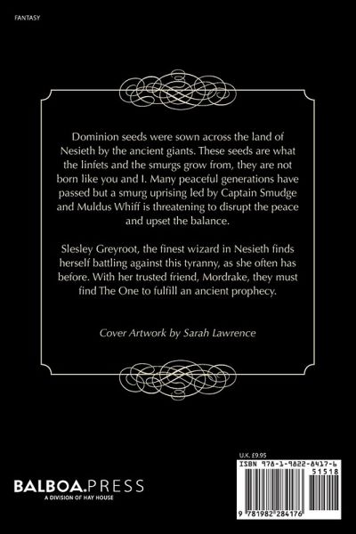 Dominion seeds were sown across the land of Nesieth by the ancient giants. These seeds are what the linfets and the smurgs grow from, they are not born like you and I. Many peaceful generations have passed but a smurg uprising led by Captain Smudge and Muldus Whiff is threatening to disrupt the peace and upset the balance. Slesley Greyroot, the finest wizard in Nesieth finds herself battling against this tyranny, as she often has before. With her trusted friend, Mordrake, they must find The One to fulfill an ancient prophecy. Cover Artwork by Sarah Lawrence