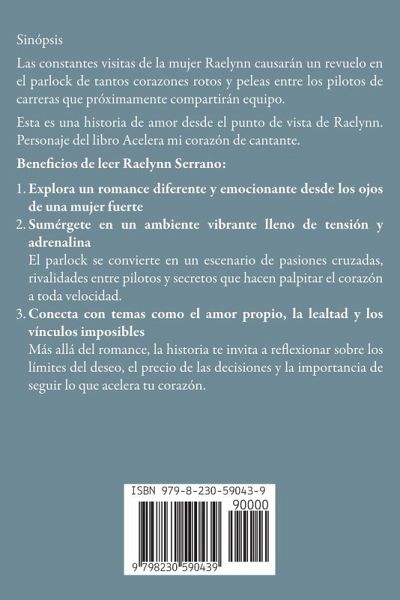 Sinópsis Las constantes visitas de la mujer Raelynn causarán un revuelo en el parlock de tantos corazones rotos y peleas entre los pilotos de carreras que próximamente compartirán equipo. Esta es una historia de amor desde el punto de vista de Raelynn. Personaje del libro Acelera mi corazón de cantante. Beneficios de leer Raelynn Serrano:Explora un romance diferente y emocionante desde los ojos de una mujer fuerte Sumérgete en un ambiente vibrante lleno de tensión y adrenalina El parlock se convierte en un escenario de pasiones cruzadas, rivalidades entre pilotos y secretos que hacen palpitar el corazón a toda velocidad. Conecta con temas como el amor propio, la lealtad y los vínculos imposibles Más allá del romance, la historia te invita a reflexionar sobre los límites del deseo, el precio de las decisiones y la importancia de seguir lo que acelera tu corazón.