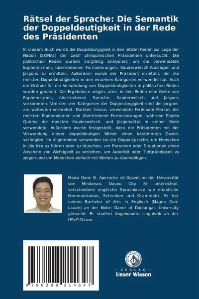 In diesem Buch wurde die Doppelzüngigkeit in den letzten Reden zur Lage der Nation (SONAs) der zwölf philippinischen Präsidenten untersucht. Die politischen Reden wurden sorgfältig analysiert, um die verwendeten Euphemismen, übertriebenen Formulierungen, Kauderwelsch-Aussagen und Jargons zu ermitteln. Außerdem wurde der Präsident ermittelt, der die meisten Doppeldeutigkeiten in den einzelnen Kategorien verwendet hat. Auch die Gründe für die Verwendung von Doppeldeutigkeiten in politischen Reden wurden genannt. Die Ergebnisse zeigen, dass in den Reden eine Reihe von Euphemismen, übertriebener Sprache, Kauderwelsch und Jargons vorkommen. Von den vier Kategorien der Doppelzüngigkeit sind die Jargons am weitesten verbreitet. Darüber hinaus verwendete Ferdinand Marcos die meisten Euphemismen und übertriebene Formulierungen, während Elpidio Quirino die meisten Kauderwelsch- und Jargonsätze in seiner Rede verwendete. Außerdem wurde festgestellt, dass die Präsidenten mit der Verwendung dieser doppeldeutigen Wörter einen bestimmten Zweck verfolgten. Im Allgemeinen verwenden sie die Doppelsprache, um Menschen in die Irre zu führen oder zu täuschen, um Personen oder Situationen einen Anschein von Wichtigkeit zu verleihen, um Autorität oder Tiefgründigkeit zu zeigen und um Menschen einfach mit Worten zu überwältigen.