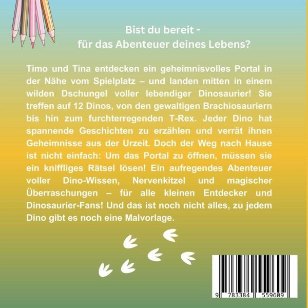 Ein spannendes Dino-Abenteuer für kleine Abenteurer mit kreativen Malvorlagen und einem Rätsel!Timo und Tala entdecken ein geheimnisvolles Portal, das sie in eine Welt voller riesiger Dinosaurier führt. In der Urzeit treffen sie auf freundliche Dinos wie den Triceratops, den Velociraptor und viele mehr, die ihnen auf ihrer Reise wertvolle Hinweise geben. Doch um nach Hause zurückzukehren, müssen Timo und Tala ein einfaches Rätsel lösen - und dabei zählt ihr Mut und ihre Neugier!Dieses Abenteuerbuch ist perfekt für kleine Dino-Fans ab 4 Jahren. Es enthält eine spannende Geschichte und kreative Malvorlagen, die den Kindern nicht nur Freude bereiten, sondern sie auch zum Mitdenken anregen.