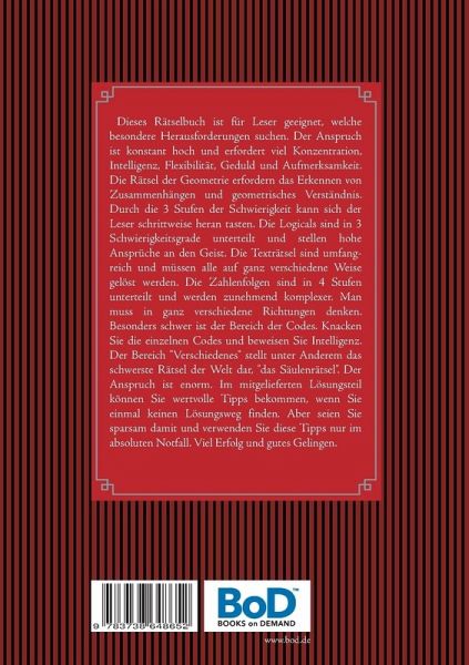 Dieser zweite Teil aus der Reihe "Rätsel für Erwachsene" beinhaltet eine Reihe neuer und innovativer Aufgaben. Nach dem erfolgreichen ersten Teil findet der Leser ganz neue Variationen der beliebten Texträtsel. Außerdem darf sich der Leser auf ausgefeilte und besonders knifflig aufgebaute Logicals freuen, welche ganz besondere Anforderungen stellen. Der mathematische Teil ist abwechslungsreich gestaltet und bietet für jedermann ganz besondere Herausforderungen. Ausgeprägte Kreativität wird beim Knacken der Codes gefordert. Diese sind sehr komplex, aber mit logischen und strukturierten Schritten aufgebaut. Im Lösungsbereich können die Tipps da schon hilfreich sein. Neu ist auch das Kapitel "Verschiedenes". Während der Leser in den vorangegangenen Rätseln immer eine ungefähre Vorstellung der Aufgaben, und somit auch seiner Herangehensweise hat, sind hier alle Aufgaben komplett gemischt. Der Lösungsweg ist daher nicht klar und stellt besondere Herausforderungen an die Kreativität. Zusammenfassend ist diese gelungene Ausgabe sehr fordernd und für geduldige Leser geeignet. Speziell zu erwähnen ist das Säulenrätsel, welches der Autor als "das schwerste Rätsel der Welt" bezeichnet. Ob dem so ist sei einmal dahingestellt. Aber der Anspruch ist außerordentlich hoch und eine Lösung zu finden tatsächlich extrem schwierig. Ein lohnenswertes Buch, welches so manchen Rätselliebhaber ab und an zur Verzweiflung treiben wird.