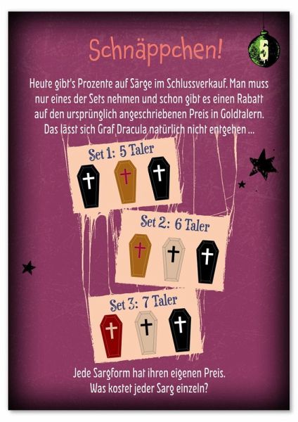 Dieser handliche Adventskalender hält für jeden Tag im Advent ein kniffeliges Rätsel zum Thema Vampire bereit: Ob Vampirjäger, die Opfer des Grafen oder Dracula höchstpersönlich in jedem der 24 lustigen Vampir-Setting gibt es kleine Rätsel zu lösen.