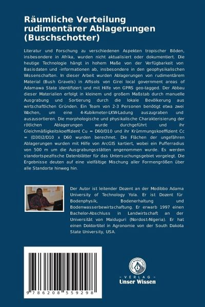 Literatur und Forschung zu verschiedenen Aspekten tropischer Böden, insbesondere in Afrika, wurden nicht aktualisiert oder dokumentiert. Die heutige Technologie hängt in hohem Maße von der Verfügbarkeit von Basisdaten und -informationen ab, insbesondere in den geophysikalischen Wissenschaften. In dieser Arbeit wurden Ablagerungen von rudimentärem Material (Bush Gravels) in Alfisols von Girei local government areas of Adamawa State identifiziert und mit Hilfe von GPRS geo-tagged. Der Abbau dieser Materialien erfolgt in kleinem und großem Maßstab durch manuelle Ausgrabung und Sortierung durch die lokale Bevölkerung aus wirtschaftlichen Gründen. Ein Team von 2-3 Personen benötigt etwa zwei Wochen, um eine 4-Kubikmeter-LKW-Ladung auszugraben und auszusortieren. Die morphologische und physikalische Charakterisierung der rötlichen Ablagerungen wurde durchgeführt und ihr Gleichmäßigkeitskoeffizient Cu = D60/D10 und ihr Krümmungskoeffizient Cc = (D30)2/D10 x D60 wurden berechnet. Die Flächen der ungefähren Ablagerungen wurden mit Hilfe von ArcGIS kartiert, wobei ein Pufferradius von 500 m um die Ausgrabungsstätten angenommen wurde. Es werden standortspezifische Datenblätter für das Untersuchungsgebiet vorgelegt. Die Ergebnisse deuten auf eine vielfältige Mischung aller Formengrößen über alle Standorte hinweg hin.