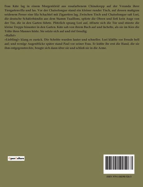 Frau Käte lag in einem Morgenkleid aus rosafarbenem Chinakrepp auf der Veranda ihrer Tiergartenvilla und las. Vor der Chaiselongue stand ein kleiner runder Tisch, auf dessen mattgrau seidenem Perser eine lila Schachtel mit Zigaretten lag. Zwischen Tisch und Chaiselongue saß Lori, die deutsche Schäferhündin aus dem Stamm Tuaillons, spitzte die Ohren und ließ kein Auge von der Tür, die in den Garten führte. Plötzlich sprang Lori auf, öffnete sich die Tür und stürzte die kleine Treppe hinunter in den Garten. Käte sah von ihrem Buch auf und lächelte, als sie im Kies die Tritte ihres Mannes hörte. Sie setzte sich auf und rief freudig: »Hallo!« »Liebling!« klang es zurück. Die Schritte wurden lauter und schneller. Lori kläffte vor Freude hell auf; und wenige Augenblicke später stand Paul vor seiner Frau. Er küßte ihr erst die Hand, die sie ihm entgegenstreckte, beugte sich dann über sie und schloß sie in die Arme.