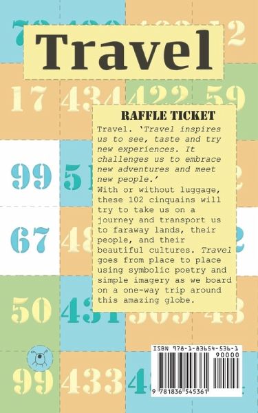 Raflle Ticket Poetry. Travel With or without luggage, these 102 short poems will try to take us on a journey and transport us to faraway lands, their people, and their beautiful cultures. Travel goes from place to place using symbolic poetry and simple imagery as we board on a one-way trip around this amazing globe. Raffle Ticket Poetry is a series of pop poetry books with hundreds of short poems and illustrations. Each poem is created with its own number, theme, and image. Each book details a topic ranging from Free Living to Romance, Travel, Animals, or The Hidden. Raffle Ticket Series is full of pop poems that wish to take poetry everywhere and in any format. The format of raffle ticket numbers may go against some traditional approaches to what poetry should be, but these poems still try to take you on a journey through life as we seek out the many experiences it has to offer. Each book has 102 five-line poems, and each poem brings together symbolic poetry and simple imagery to touch on and reflect on human emotions. These poems are ideal to read during a coffee break, to smile at, or to ponder over. They are designed to be short, snappy, even disposable, but forever optimistic. They can be cut out of the book and sent to someone you think may also like them, stuck on the fridge, or just pop the book or ebook on your phone or in your bag.