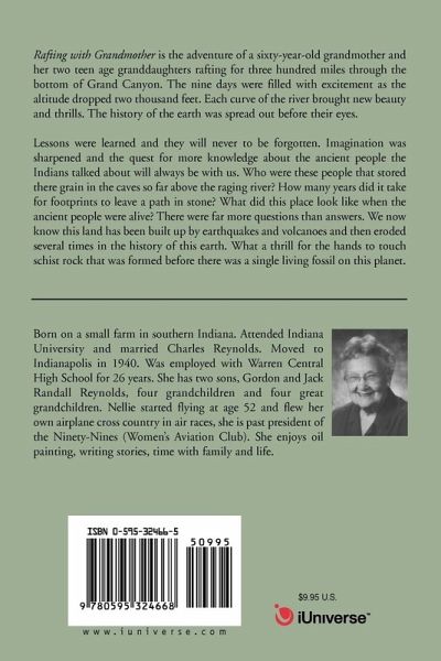 Rafting with Grandmother is the adventure of a sixty-year-old grandmother and her two teen age granddaughters rafting for three hundred miles through the bottom of Grand Canyon. The nine days were filled with excitement as the altitude dropped two thousand feet. Each curve of the river brought new beauty and thrills. The history of the earth was spread out before their eyes. Lessons were learned and they will never to be forgotten. Imagination was sharpened and the quest for more knowledge about the ancient people the Indians talked about will always be with us. Who were these people that stored there grain in the caves so far above the raging river? How many years did it take for footprints to leave a path in stone? What did this place look like when the ancient people were alive? There were far more questions than answers. We now know this land has been built up by earthquakes and volcanoes and then eroded several times in the history of this earth. What a thrill for the hands to touch schist rock that was formed before there was a single living fossil on this planet.