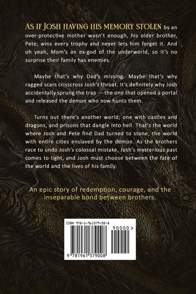 An epic story of redemption, courage, and the inseparable bond between brothers! As if Josh having his memory stolen by an over-protective mother wasn't enough, his older brother, Pete, wins every trophy and never lets him forget it. And oh yeah, Mom's an ex-god of the underworld, so it's no surprise their family has enemies. Maybe that's why Dad's missing. Maybe that's why ragged scars crisscross Josh's throat. It's definitely why Josh accidentally sprung the trap - the one that opened a portal and released the demon who now hunts them. Turns out there's another world; one with castles and dragons, and prisons that dangle into hell. That's the world where Josh and Pete find Dad turned to stone, the world with entire cities enslaved by the demon. As the brothers race to undo Josh's colossal mistake, Josh's mysterious past comes to light, and Josh must choose between the fate of the world and the lives of his family.