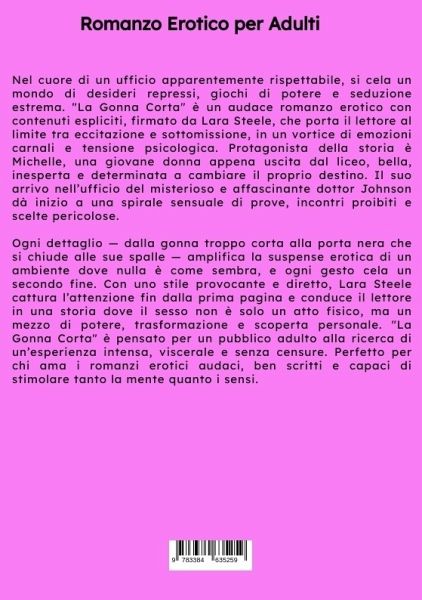 "Ragazze Permalose - Romanzo Erotico con Sesso Esplicito - per Adulti" di Lara Steele è una storia audace, vibrante e irresistibilmente provocante, che mescola tensione sportiva, desideri repressi e sensualità inarrestabile. Al centro della scena c'è Lauren, la prima donna nella storia della NFL, pronta a scrivere la storia con un calcio decisivo. Ma quando il sogno sfuma per un soffio, quello che inizia come un fallimento sportivo si trasforma in un'esplosione di emozioni, rabbia, vulnerabilità... e passione. Lauren non è solo una campionessa del football: è una donna forte, complessa, sensuale, che non si lascia definire da un errore né tantomeno domare da nessuno. In un mondo dominato dagli uomini, si fa largo con grinta e desiderio, aprendo la porta a un erotismo esplosivo e senza filtri. Con scene di sesso esplicito pensate per un pubblico adulto, "Ragazze Permalose" ti catapulta nel cuore pulsante dello sport americano, ma soprattutto dentro la testa - e il corpo - di una protagonista che non ha paura di vivere e amare intensamente. Perfetto per chi cerca un romanzo erotico con una trama forte, personaggi sfaccettati e un'ambientazione inedita, questo libro è una corsa travolgente tra passione, sfide e piacere senza compromessi.