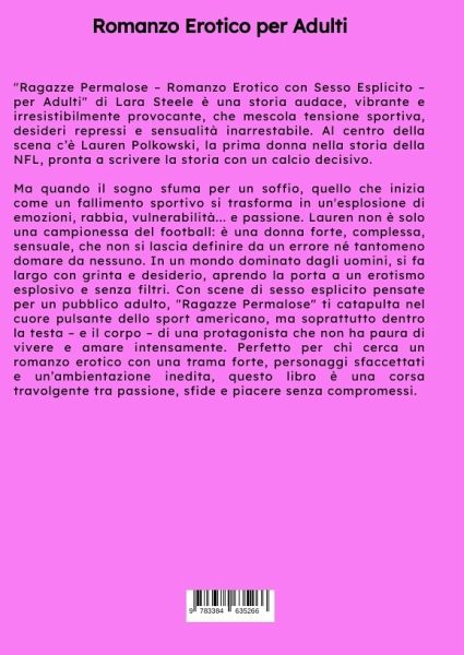 "Ragazze Permalose - Romanzo Erotico con Sesso Esplicito - per Adulti" di Lara Steele è una storia audace, vibrante e irresistibilmente provocante, che mescola tensione sportiva, desideri repressi e sensualità inarrestabile. Al centro della scena c'è Lauren, la prima donna nella storia della NFL, pronta a scrivere la storia con un calcio decisivo. Ma quando il sogno sfuma per un soffio, quello che inizia come un fallimento sportivo si trasforma in un'esplosione di emozioni, rabbia, vulnerabilità... e passione. Lauren non è solo una campionessa del football: è una donna forte, complessa, sensuale, che non si lascia definire da un errore né tantomeno domare da nessuno. In un mondo dominato dagli uomini, si fa largo con grinta e desiderio, aprendo la porta a un erotismo esplosivo e senza filtri. Con scene di sesso esplicito pensate per un pubblico adulto, "Ragazze Permalose" ti catapulta nel cuore pulsante dello sport americano, ma soprattutto dentro la testa - e il corpo - di una protagonista che non ha paura di vivere e amare intensamente. Perfetto per chi cerca un romanzo erotico con una trama forte, personaggi sfaccettati e un'ambientazione inedita, questo libro è una corsa travolgente tra passione, sfide e piacere senza compromessi.