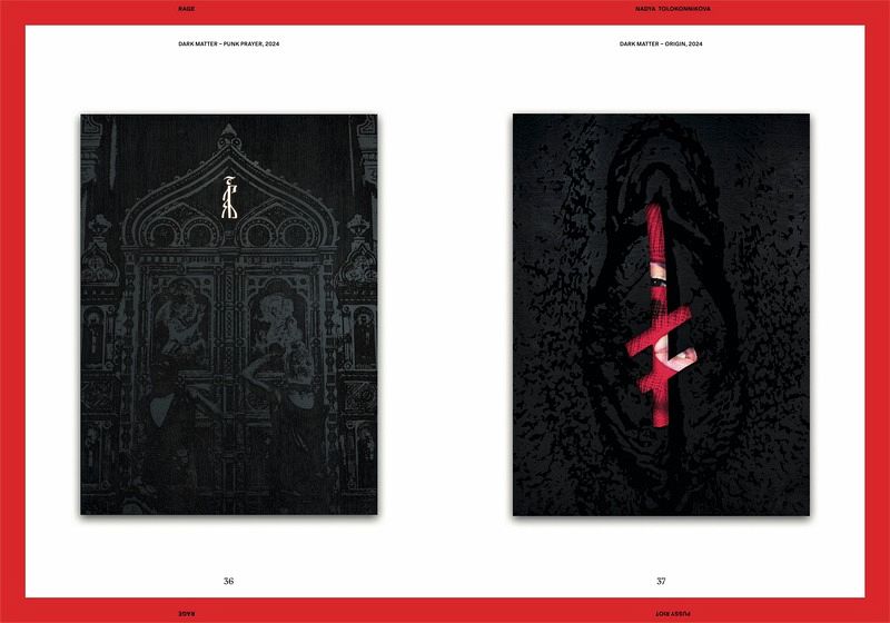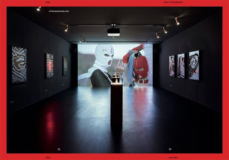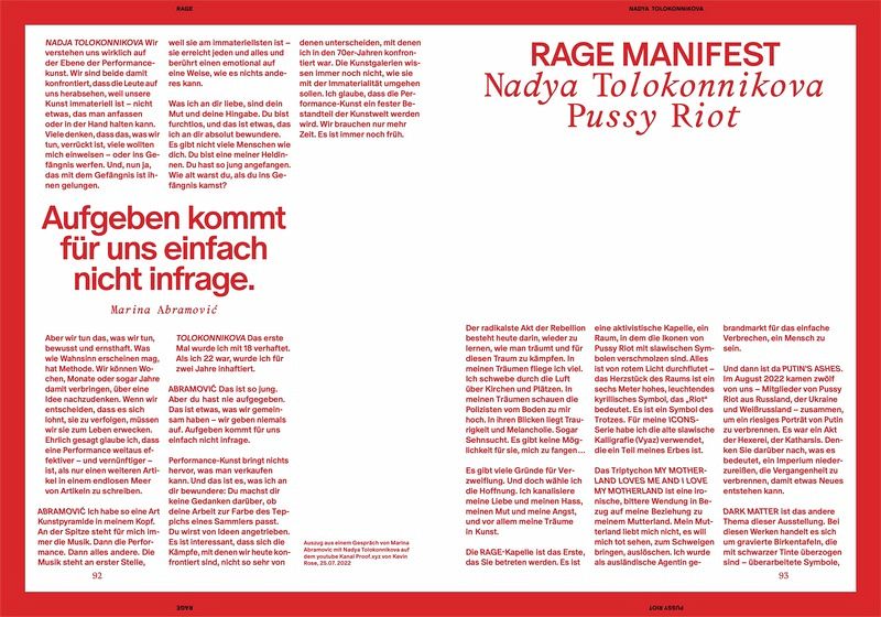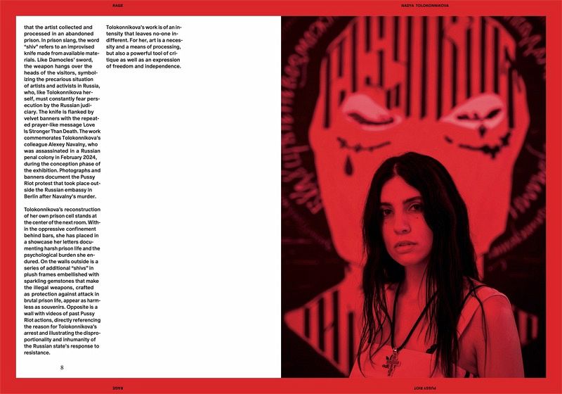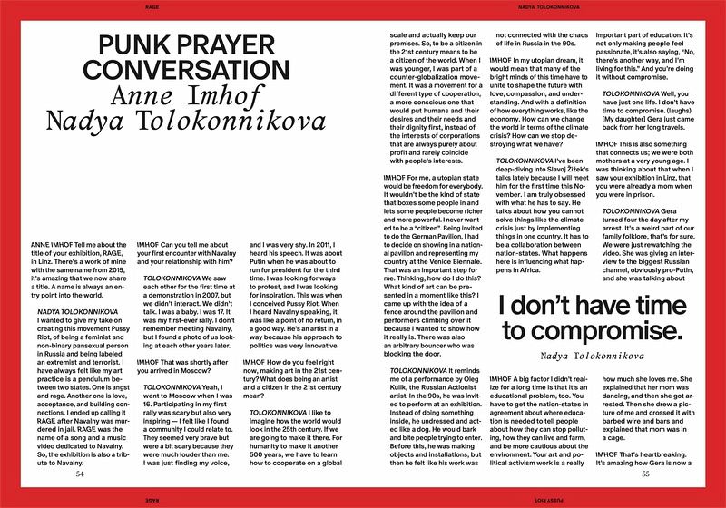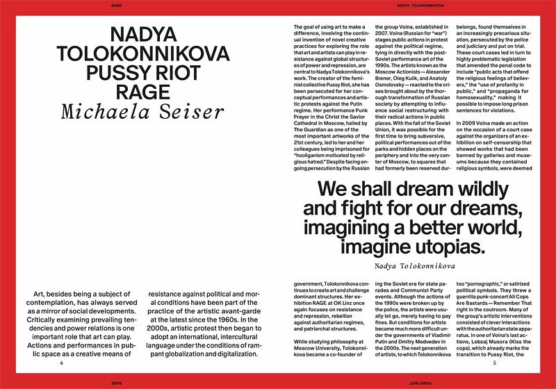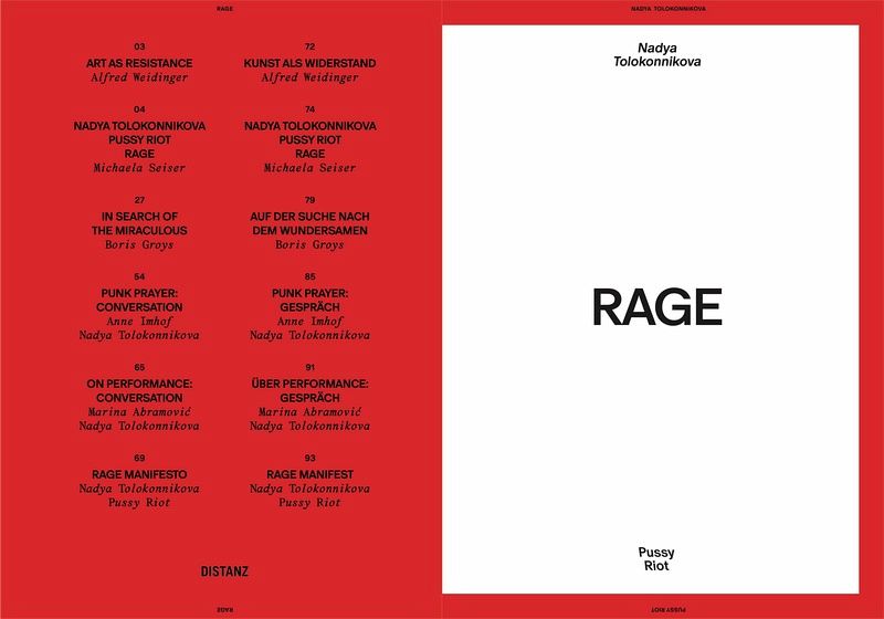 Die Publikation RAGE dokumentiert Nadya Tolokonnikovas erste Einzelausstellung in Europa in Linz und fasst ihre Arbeiten seit 2009 zusammen, ergänzt durch Essays von Boris Groys und der Kuratorin Michaela Seiser sowie zwei Gespräche, die Tolokonnikova mitMarina Abramovic und Anne Imhof führte.