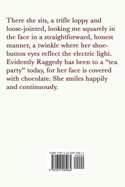 There she sits, a trifle loppy and loose-jointed, looking me squarely in the face in a straightforward, honest manner, a twinkle where her shoe-button eyes reflect the electric light. Evidently Raggedy has been to a "tea party" today, for her face is covered with chocolate. She smiles happily and continuously.
