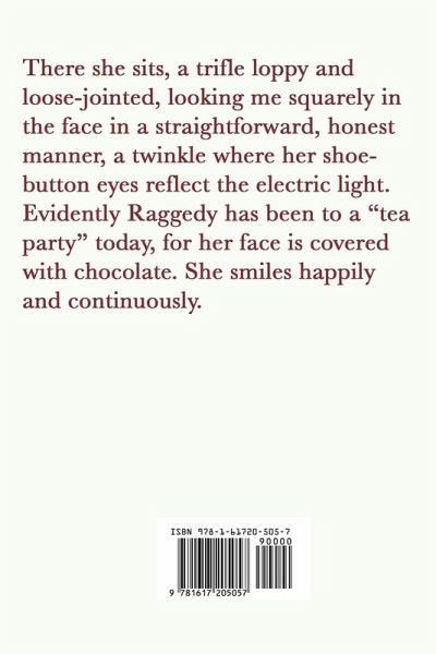 There she sits, a trifle loppy and loose-jointed, looking me squarely in the face in a straightforward, honest manner, a twinkle where her shoe-button eyes reflect the electric light. Evidently Raggedy has been to a "tea party" today, for her face is covered with chocolate. She smiles happily and continuously.