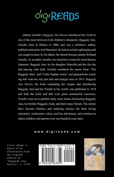 Johnny Gruelle’s "Raggedy Ann Stories" introduced the world to one of the most beloved of all children’s characters, Raggedy Ann. Gruelle, born in Illinois in 1880, and was a children’s author, political cartoonist, and illustrator. He had an artistic upbringing and was taught to draw by his father, the famed Hoosier painter Richard Gruelle. As an adult, Gruelle was inspired to create his most famous character, Raggedy Ann, by his daughter Marcella and the fun she had playing with dolls. Gruelle combined the names from "The Raggedy Man" and "Little Orphan Annie" and patented the iconic rag doll with her red yarn hair and triangle nose in 1915. "Raggedy Ann Stories", his book explaining her origins and introducing Raggedy Ann and her friends to the world, was published in 1918 and both the book and doll were great commercial successes. Gruelle went on to publish many more books chronicling Raggedy Ann, her brother Raggedy Andy, and their many friends. The stories have become timeless and enduring classics for their loving characters, wholesome values, and fun adventures, and continue to charm children and parents over one hundred years later. This edition is printed on premium acid-free paper.