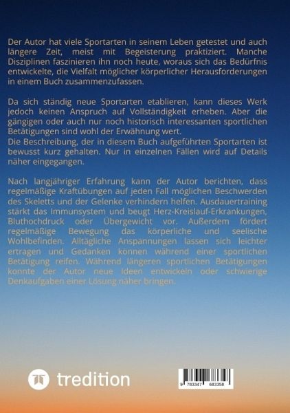 Der Autor hat viele Sportarten in seinem Leben getestet und auch längere Zeit, meist mit Begeisterung praktiziert. Manche Disziplinen faszinieren ihn noch heute, woraus sich das Bedürfnis entwickelte, die Vielfalt möglicher körperlicher Herausforderungen in einem Buch zusammenzufassen. Da sich ständig neue Sportarten etablieren, kann dieses Werk jedoch keinen Anspruch auf Vollständigkeit erheben. Aber die gängigen oder auch nur noch historisch interessanten sportlichen Betätigungen sind wohl der Erwähnung wert.Die Beschreibung, der in diesem Buch aufgeführten Sportarten ist bewusst kurz gehalten. Nur in einzelnen Fällen wird auf Details näher eingegangen. Nach langjähriger Erfahrung kann der Autor berichten, dass regelmäßige Kraftübungen auf jeden Fall möglichen Beschwerden des Skeletts und der Gelenke verhindern helfen. Ausdauertraining stärkt das Immunsystem und beugt Herz-Kreislauf-Erkrankungen, Bluthochdruck oder Übergewicht vor. Außerdem fördert regelmäßige Bewegung das körperliche und seelische Wohlbefinden. Alltägliche Anspannungen lassen sich leichter ertragen und Gedanken können während einer sportlichen Betätigung reifen. Während längeren sportlichen Betätigungen konnte der Autor neue Ideen entwickeln oder schwierige Denkaufgaben einer Lösung näher bringen.