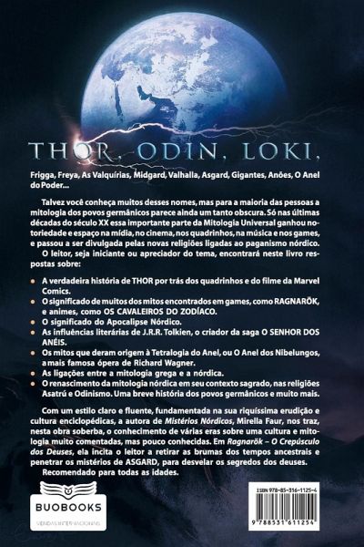 "Thor, Odin, Loki, Frigga, Freya, As Valquírias, Midgard, Valhalla, Asgard, Gigantes, Anões, O Anel do Poder... Talvez você conheça muitos desses nomes, mas para a maioria das pessoas a mitologia dos povos germânicos parece ainda um tanto obscura. Nesse livro, com um estilo claro e fluente, Mirella Faur, autora do best-seller e obra de referência Mistérios Nórdicos, nos traz o conhecimento de várias eras sobre uma cultura e mitologia muito comentadas, mas pouco conhecidas. Ela dá ao leitor respostas sobre a verdadeira história de THOR por trás dos quadrinhos e do filme da Marvel Comics; explica o significado de muitos dos mitos encontrados em games, como Ragnarök, e animes, como Os Cavaleiros do Zodíaco. Além disso, o leitor, seja ele iniciante ou apreciador do tema, descobrirá o significado do Apocalipse Nórdico e conhecerá as influências literárias de J. R. R. Tolkien. Uma obra de referência que incita o leitor a retirar as brumas dos tempos ancestrais e penetrar os mistérios de ASGARD, a fim de desvelar os segredos dos deuses."