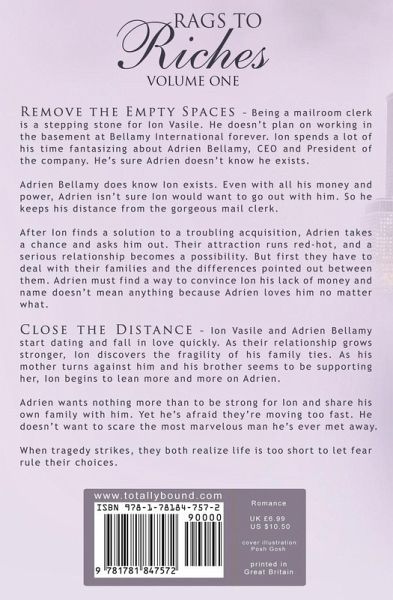 Remove the Empty Spaces Finding a solution for his boss brings Ion to the point of having his deepest fantasies come true. Being a mailroom clerk is a stepping stone for Ion Vasile. He doesn't plan on working in the basement at Bellamy International forever. Ion spends a lot of his time fantasising about Adrien Bellamy, CEO and President of the company. He's sure Adrien doesn't know he exists. Adrien Bellamy does know Ion exists. Even with all his money and power, Adrien isn't sure Ion would want to go out with him. So he keeps his distance from the gorgeous mail clerk. After Ion finds a solution to a troubling acquisition, Adrien takes a chance and asks him out. Their attraction runs red-hot, and a serious relationship becomes a possibility. But first they have to deal with their families and the differences pointed out between them. Adrien must find a way to convince Ion his lack of money and name doesn't mean anything because Adrien loves him no matter what. Close the Distance Being in love isn't always roses and sunshine. Ion Vasile and Adrien Bellamy start dating and fall in love quickly. As their relationship grows stronger, Ion discovers the fragility of his family ties. As his mother turns against him and his brother seems to be supporting her, Ion begins to lean more and more on Adrien. Adrien wants nothing more than to be strong for Ion and share his own family with him. Yet he's afraid they're moving too fast. He doesn't want to scare the most marvellous man he's ever met away. When tragedy strikes, they both realise life is too short to let fear rule their choices.
