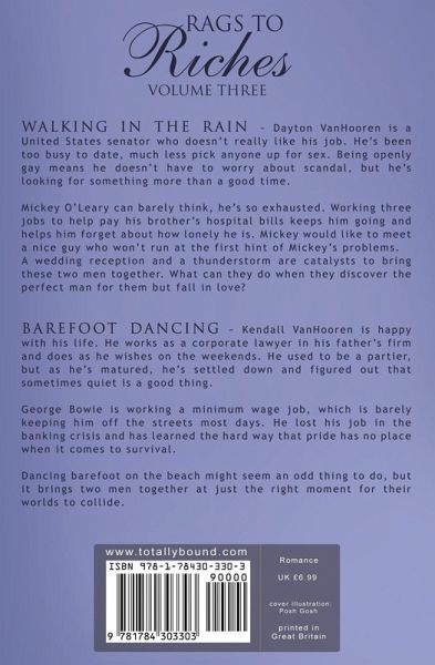 Walking in the Rain Sometimes fate brings us the right person to make our world perfect. Dayton VanHooren is a United States senator who doesn't really like his job. He's been too busy to date, much less pick anyone up for sex. Being openly gay means he doesn't have to worry about scandal, but he's looking for something more than a good time. Mickey O'Leary can barely think, he's so exhausted. Working three jobs to help pay his brother's hospital bills keeps him going and helps him forget about how lonely he is. Mickey would like to meet a nice guy who won't run at the first hint of Mickey's problems. A wedding reception and a thunderstorm are catalysts to bring these two men together. What can they do when they discover the perfect man for them but fall in love? Barefoot Dancing A moment in time can be the most pivotal one in our lives. Kendall VanHooren is happy with his life. He works as a corporate lawyer in his father's firm and does as he wishes on the weekends. He used to be a partier, but as he's matured, he's settled down and figured out that sometimes quiet is a good thing. George Bowie is working a minimum wage job, which is barely keeping him off the streets most days. He lost his job in the banking crisis and has learned the hard way that pride has no place when it comes to survival. Dancing barefoot on the beach might seem an odd thing to do, but it brings two men together at just the right moment for their worlds to collide.