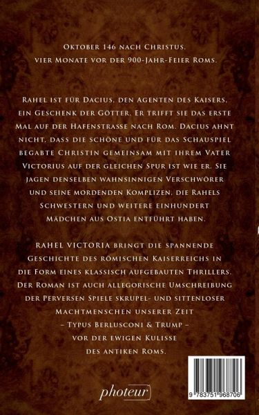 Oktober 146 nach Christus. vier Monate vor der 900-Jahr-Feier Roms. Rahel ist für Dacius, den Agenten des Kaisers, ein Geschenk der Götter. er trifft sie das erste mal auf der Hafenstraße nach Rom. Dacius ahnt nicht, dass die schöne und für das Schauspiel begabte Christin gemeinsam mit ihrem Vater Victorius auf der gleichen Spur ist wie er. Sie jagen denselben wahnsinnigen Verschwörer und seine mordenden Komplizen, die Rahels Schwestern und weitere einhundert Mädchen aus Ostia entführt haben. Rahel Victoria bringt die spannende Geschichte des römischen Kaiserreichs in die Form eines klassisch aufgebauten Thrillers. Der Roman ist auch allegorische Umschreibung der perversen Spiele skrupel- und sittenloser Machtmenschen unserer Zeit vor der ewigen Kulisse des antiken Roms.