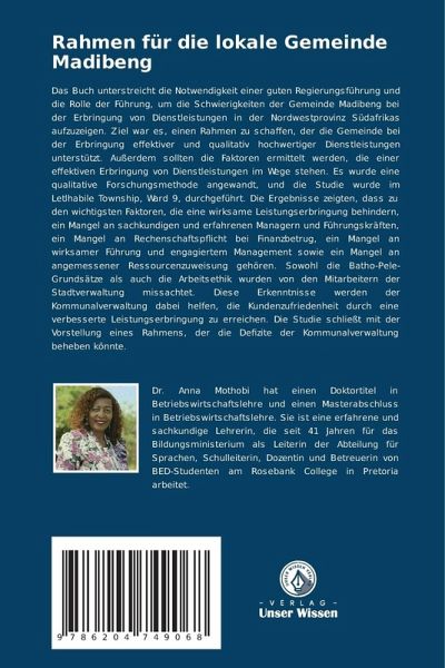 Das Buch unterstreicht die Notwendigkeit einer guten Regierungsführung und die Rolle der Führung, um die Schwierigkeiten der Gemeinde Madibeng bei der Erbringung von Dienstleistungen in der Nordwestprovinz Südafrikas aufzuzeigen. Ziel war es, einen Rahmen zu schaffen, der die Gemeinde bei der Erbringung effektiver und qualitativ hochwertiger Dienstleistungen unterstützt. Außerdem sollten die Faktoren ermittelt werden, die einer effektiven Erbringung von Dienstleistungen im Wege stehen. Es wurde eine qualitative Forschungsmethode angewandt, und die Studie wurde im Letlhabile Township, Ward 9, durchgeführt. Die Ergebnisse zeigten, dass zu den wichtigsten Faktoren, die eine wirksame Leistungserbringung behindern, ein Mangel an sachkundigen und erfahrenen Managern und Führungskräften, ein Mangel an Rechenschaftspflicht bei Finanzbetrug, ein Mangel an wirksamer Führung und engagiertem Management sowie ein Mangel an angemessener Ressourcenzuweisung gehören. Sowohl die Batho-Pele-Grundsätze als auch die Arbeitsethik wurden von den Mitarbeitern der Stadtverwaltung missachtet. Diese Erkenntnisse werden der Kommunalverwaltung dabei helfen, die Kundenzufriedenheit durch eine verbesserte Leistungserbringung zu erreichen. Die Studie schließt mit der Vorstellung eines Rahmens, der die Defizite der Kommunalverwaltung beheben könnte.