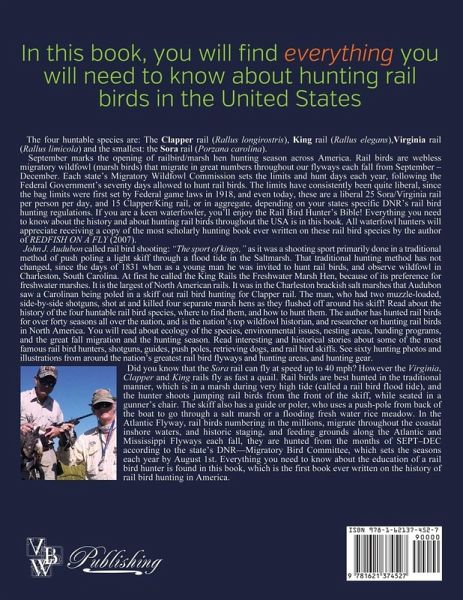 In this book, you will find everything you will need to know about hunting rail birds in the United States. The four huntable species are: The Clapper rail (Rallus longirostris), King rail (Rallus elegans),Virginia rail (Rallus limicola) and the smallest: the Sora rail (Porzana carolina). September marks the opening of railbird/marsh hen hunting season across America. Rail birds are webless migratory wildfowl (marsh birds) that migrate in great numbers throughout our flyways each fall from September - December. Each state's Migratory Wildfowl Commission sets the limits and hunt days each year, following the Federal Government's seventy days allowed to hunt rail birds. The limits have consistently been quite liberal, since the bag limits were first set by Federal game laws in 1918, and even today, these are a liberal 25 Sora/Virginia rail per person per day, and 15 Clapper/King rail, or in aggregate, depending on your states specific DNR's rail bird hunting regulations. If you are a keen waterfowler, you'll enjoy the Rail Bird Hunter's Bible! Everything you need to know about the history and about hunting rail birds throughout the USA is in this book. All waterfowl hunters will appreciate receiving a copy of the most scholarly hunting book ever written on these rail bird species by the author of "REDFISH ON A FLY" (2007). John J. Audubon called rail bird shooting: "The sport of kings," as it was a shooting sport primarily done in a traditional method of push poling a light skiff through a flood tide in the Saltmarsh. That traditional hunting method has not changed, since the days of 1831 when as a young man he was invited to hunt rail birds, and observe wildfowl in Charleston, South Carolina. At first he called the King Rails the Freshwater Marsh Hen, because of its preference for freshwater marshes. It is the largest of North American rails. It was in the Charleston brackish salt marshes that Audubon saw a Carolinan being poled in a skiff out rail bird hunting for Clapper rail. The man, who had two muzzle-loaded, side-by-side shotguns, shot at and killed four separate marsh hens as they flushed off around his skiff! Read about the history of the four huntable rail bird species, where to find them, and how to hunt them. The author has hunted rail birds for over forty seasons all over the nation, and is the nation's top wildfowl historian, and researcher on hunting rail birds in North America. You will read about ecology of the species, environmental issues, nesting areas, banding programs, and the great fall migration and the hunting season. Read interesting and historical stories about some of the most famous rail bird hunters, shotguns, guides, push poles, retrieving dogs, and rail bird skiffs. See sixty hunting photos and illustrations from around the nation's greatest rail bird flyways and hunting areas, and hunting gear. Did you know that the Sora rail can fly at speed up to 40 mph? However the Virginia, Clapper and King rails fly as fast a quail. Rail birds are best hunted in the traditional manner, which is in a marsh during very high tide (called a rail bird flood tide), and the hunter shoots jumping rail birds from the front of the skiff, while seated in a gunner's chair. The skiff also has a guide or poler, who uses a push-pole from back of the boat to go through a salt marsh or a flooding fresh water rice meadow. In the Atlantic Flyway, rail birds numbering in the millions, migrate throughout the coastal inshore waters, and historic staging, and feeding grounds along the Atlantic and Mississippi Flyways each fall, they are hunted from the months of SEPT-DEC according to the state's DNR-Migratory Bird Committee, which sets the seasons each year by August 1st. Everything you need to know about the education of a rail bird hunter is found in this book, which is the first book ever written on the history of rail bird hunting in America.