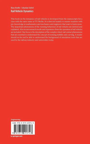 This book on the dynamics of rail vehicles is developed from the manuscripts for a class with the same name at TU Berlin. It is directed mainly to master students with pre-knowledge in mathematics and mechanics and engineers that want to learn more. The important phenomena of the running behaviour of rail vehicles are derived and explained. Also recent research results and experience from the operation of rail vehicles are included. One focus is the description of the complex wheel-rail contact phenomena that are essential to understand the concept of running stability and curving. A reader should in the end be able to understand the background of simulation tools that are used by the railway industry and universities today.