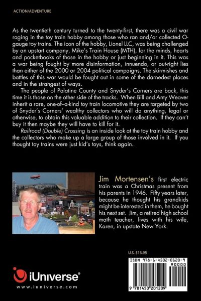 As the twentieth century turned to the twenty-first, there was a civil war raging in the toy train hobby between those who ran and/or collected O-gauge toy trains. The icon of the hobby, Lionel LLC, was being challenged by an upstart company, Mike's Train House (MTH), for the minds, hearts and pocketbooks of those in the hobby or just beginning in it. This was a war being fought by more disinformation, innuendo, or out-right lies than either of the 2000 or 2004 political campaigns. The skirmishes and battles of this war would be fought out in some of the darnedest places and in the strangest of ways. The people of Palatine County and Snyder's Corners are back, this time it is those on the other side of the tracks. When Bill and Amy Weaver inherit a rare, one-of-a-kind toy train locomotive they are targeted by two of Snyder's Corners' wealthy collectors who will do anything, legal or otherwise, to obtain this valuable addition to their collection. If they can't buy it then maybe they will have to kill for it. Railroad (Double) Crossing is an inside look at the toy train hobby and the collectors who make up a large group of those involved in it. If you thought toy trains were just kid's toys, think again.