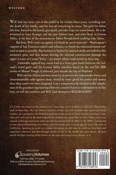 Will Toal has seen a lot of the world in his twenty-three years, including war, the death of his family, and the loss of everything he owns. The gold his father left him, buried in the family graveyard, provides hope for a new future. He is determined to leave Georgia and the past behind him, and start fresh in Carson Valley, at the base of the mountainous Sierra Nevada bowl cradling Lake Tahoe. But here, Will comes up against a Goliath he never expected-Washington's support of San Francisco capital and influence to finish the transcontinental railroad as soon as possible. Big business is backed by national pride and unbelievable monetary gain, and this means driving the railroad construction through the upper reaches of Carson Valley-no matter whose land stands in their way. Untenable right-of-way issues lead to a fierce gun battle between the railroad's hired guns and the Carson Valley ranchers based on the real-life 1880 events of Mussel Slough, California, just outside the city of Hanford. Will and his fellow ranchers must try to survive the indomitable forces and insurmountable odds against them, fueled by more greed for power and money than they could ever have imagined. Can a compromise be reached in the completion of the grandest engineering effort the country has ever undertaken in its history, or will the ranchers and Will find themselves RAILROADED?
