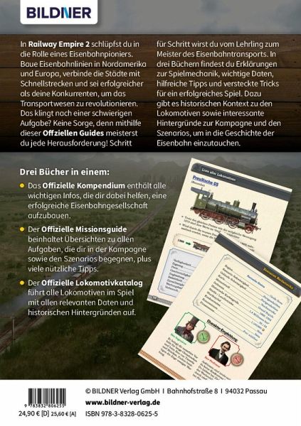 Das Offizielle Kompendium enthält alle wichtigen Infos, die dir dabei helfen, eine erfolgreiche Eisenbahngesellschaft aufzubauen.Der Offizielle Missionsguide beinhaltet Übersichten zu allen Aufgaben, die dir in der Kampagne sowie den Szenarios begegnen, plus viele nützliche Tipps.Der Offizielle Lokomotivkatalog führt alle Lokomotiven im Spiel mit allen relevanten Daten und historischen Hintergründen auf.
