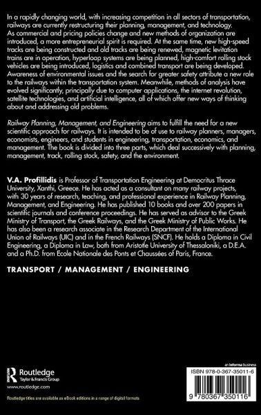 V.A. Profillidis is Professor of Transportation Engineering at Democritus Thrace University, Xanthi, Greece. He has acted as a consultant on many railway projects, with 30 years of research, teaching, and professional experience in Railway Planning, Management, and Engineering. He has published 10 books and over 200 papers in scientific journals and conference proceedings. He has served as advisor to the Greek Ministry of Transport, the Greek Railways, and the Greek Ministry of Public Works. He has also been a research associate in the Research Department of the International Union of Railways (UIC) and in the French Railways (SNCF). He holds a Diploma in Civil Engineering, a Diploma in Law, both from Aristotle University of Thessaloniki, a D.E.A. and a Ph.D. from Ecole Nationale des Ponts et Chaussées of Paris, France.