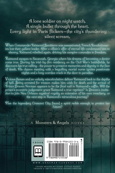 A lone soldier on night watch. A single bullet through the heart. Every light in Paris flickers-the city's thundering silent scream. When Commander Raimond Banitierre was assassinated, French Revolutionaries lost their gallant leader. After a villain's offer of eternal life condemned him to slavery, Raimond rebelled again, driving his vampire comrades to freedom. Raimond escapes to Savannah, Georgia where his dream of becoming a doctor comes true. During his trial-by-fire residency on the Civil War's battlefields, he discovers his true calling-the power to preserve memories and dignity in the face of death. His chance meeting with a beguiling mortal nurse ignites passionate nights and a long overdue crack in the door to paradise. Vicious flames and an unholy miscalculation deliver Raimond back to the depths of hell. Being arrested for treason makes him wish for death and the arrival of Prince Draven Norman appears to be the final nail in Raimond's coffin. Will the prince's eccentric judgement grant Raimond a true reprieve? Is Draven's invitation to join New Orleans mystical royalty an extension of his own treachery, or the next step in Raimond's miraculous journey? Has the legendary Crescent City found a spirit noble enough to protect her future?