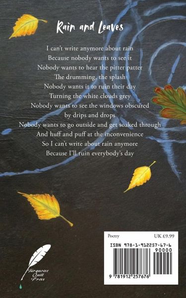 I can't write anymore about rain Because nobody wants to see it Nobody wants to hear the pitter patter The drumming, the splash Nobody wants it to ruin their day Turning the white clouds grey Nobody wants to see the windows obscured by drips and drops Nobody wants to go outside and get soaked through And huff and puff at the inconvenience So I can't write about rain anymore Because I'll ruin everybody's day Rain and Leaves is Elizabeth Lockwood's second book of poetry and illustrations. Her first book of poetry, Waves of Stardust, and her memoir, Little Something, are also available.