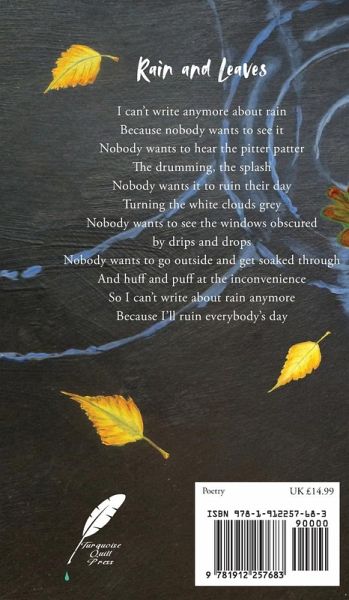 I can't write anymore about rain Because nobody wants to see it Nobody wants to hear the pitter patter The drumming, the splash Nobody wants it to ruin their day Turning the white clouds grey Nobody wants to see the windows obscured by drips and drops Nobody wants to go outside and get soaked through And huff and puff at the inconvenience So I can't write about rain anymore Because I'll ruin everybody's day Rain and Leaves is Elizabeth Lockwood's second book of poetry and illustrations. Her first book of poetry, Waves of Stardust, and her memoir, Little Something, are also available.