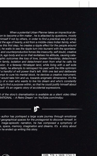 When a potential Urban Planner decides to dedicate rest his life for filmmaking he is attacked by questions, mostly by himself if not by others. At the age of twenty, a kid from a typical middleclass Indian family, when takes that desiccation for himself, he creates a ripple effect for the people surrounding him. He waits to see the ripple turn into tsunami with constant counterproductive forces like insecurity, self doubt, creative block, ego etc. that modifies his behaviour to cause catastrophic effects like loss of love, broken friendship, detachment from family, isolation and even detachment from his own passion. In a faraway Himalayan land while living with a self exile mentality, he attempts to retrospect his past with the little will power and optimism that's left, one last and deliberate attempt to cure his mental block he devices a creative instrument that would take him and us towards enigmatic dimensions. It's the story of a man who wants to be a film maker and who constantly tries to justify to himself regarding why he wants to do so. It's the story of an accidental expressionist. part of the story's dramatiation is available as a video called 'IRRATIONAL ~ A Retro Dream' on YouTube.com/imdiyu.